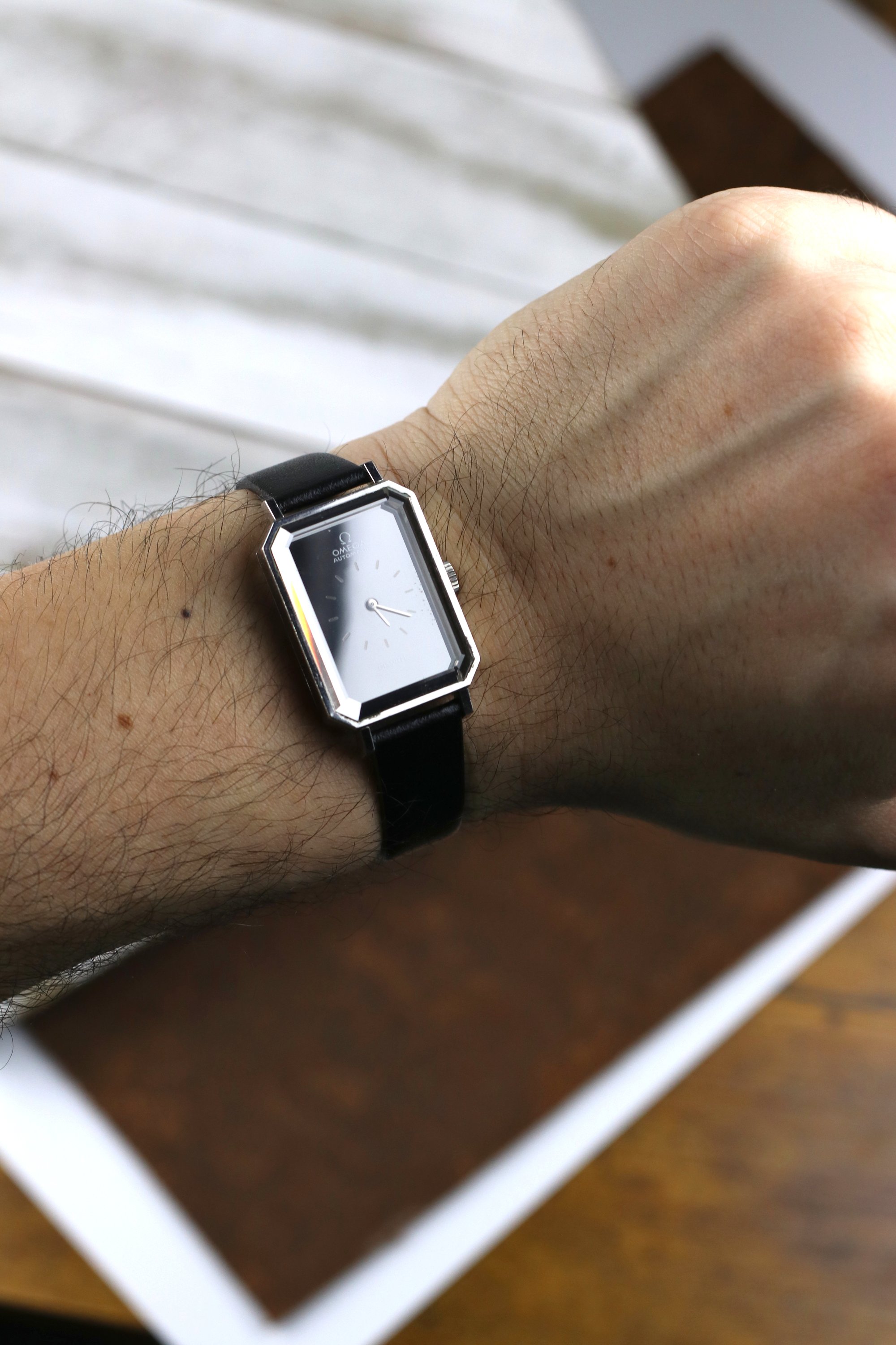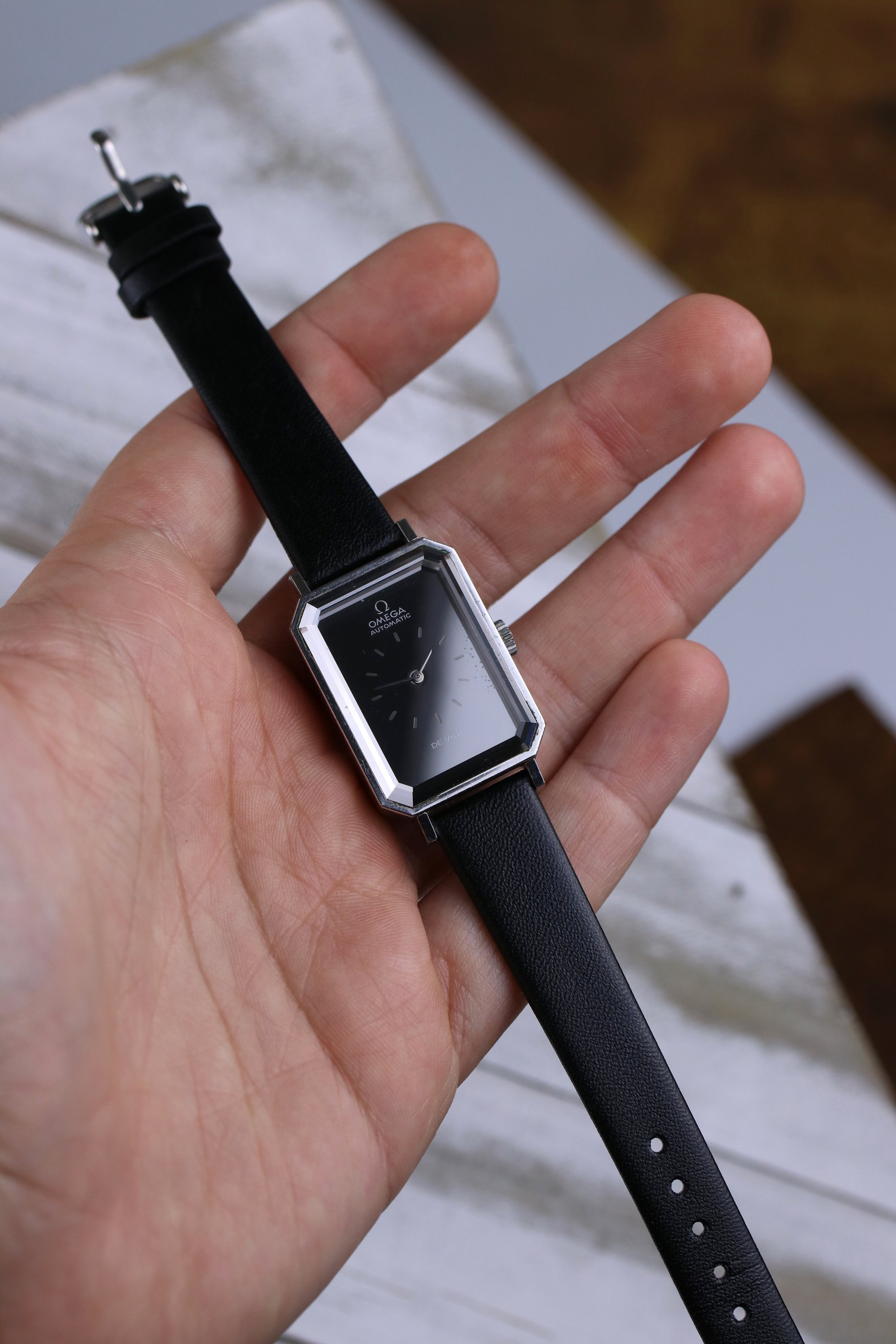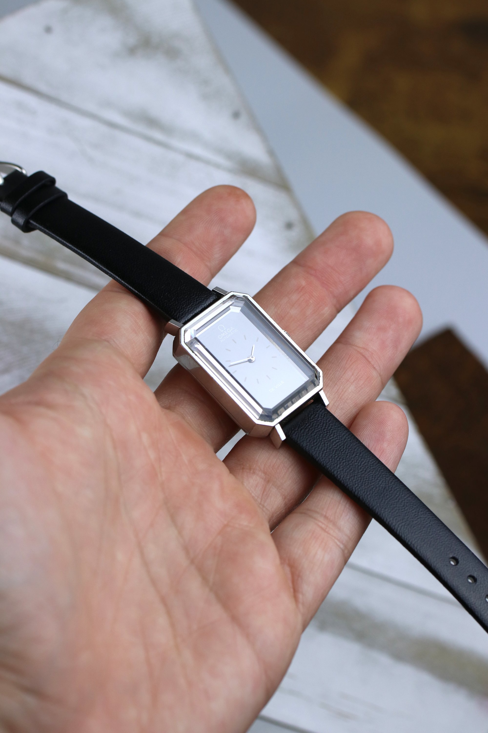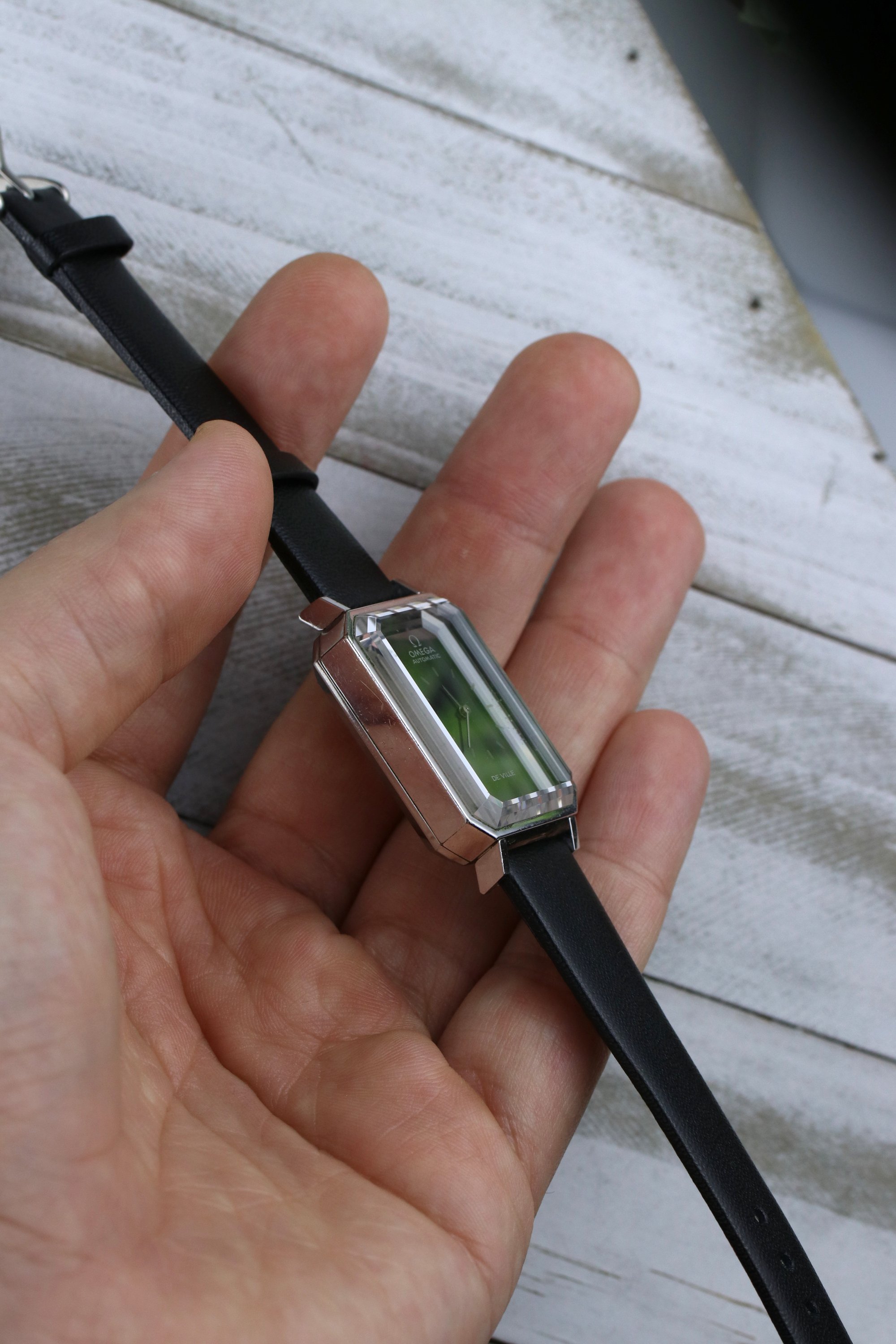 Okay back to this specific De Ville, its a striking example of Grima's design language. Has this rectangle tank style case with dramatically beveled edges, bold and angled cuts on the corners of the glass cut crystal. The dial has a stunning effect, fades from deep black to near silver color depending on the light. The occasional glimpses of iridescence on the crystal as the light beams down the crystal. A pretty piece with lots of history. It's powered by the automatic 661 Omega Cal. that holds time well. It's on a leather aftermarket band. Happy to answer any questions and provide more pictures!