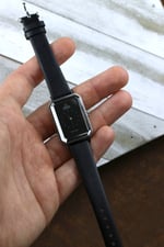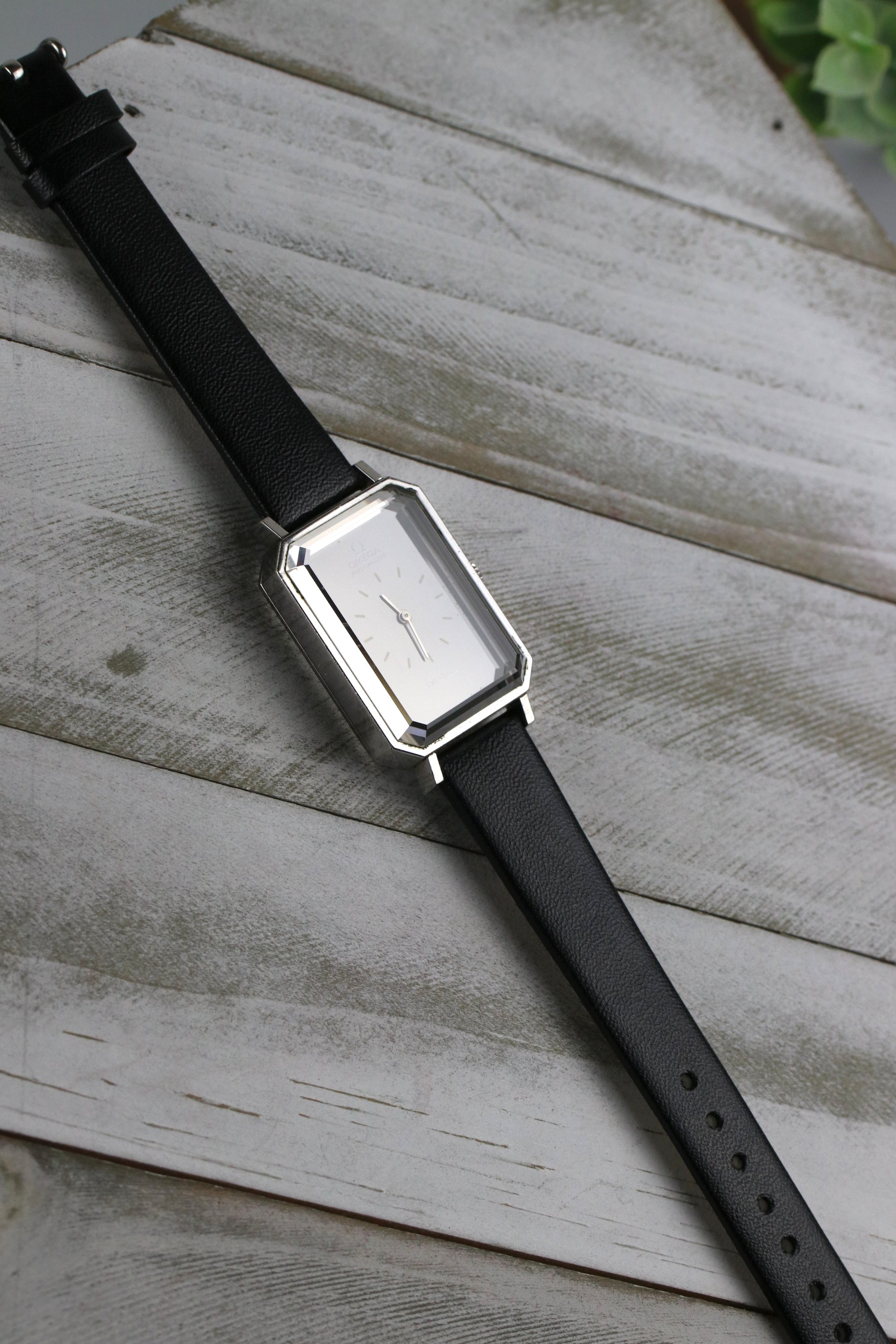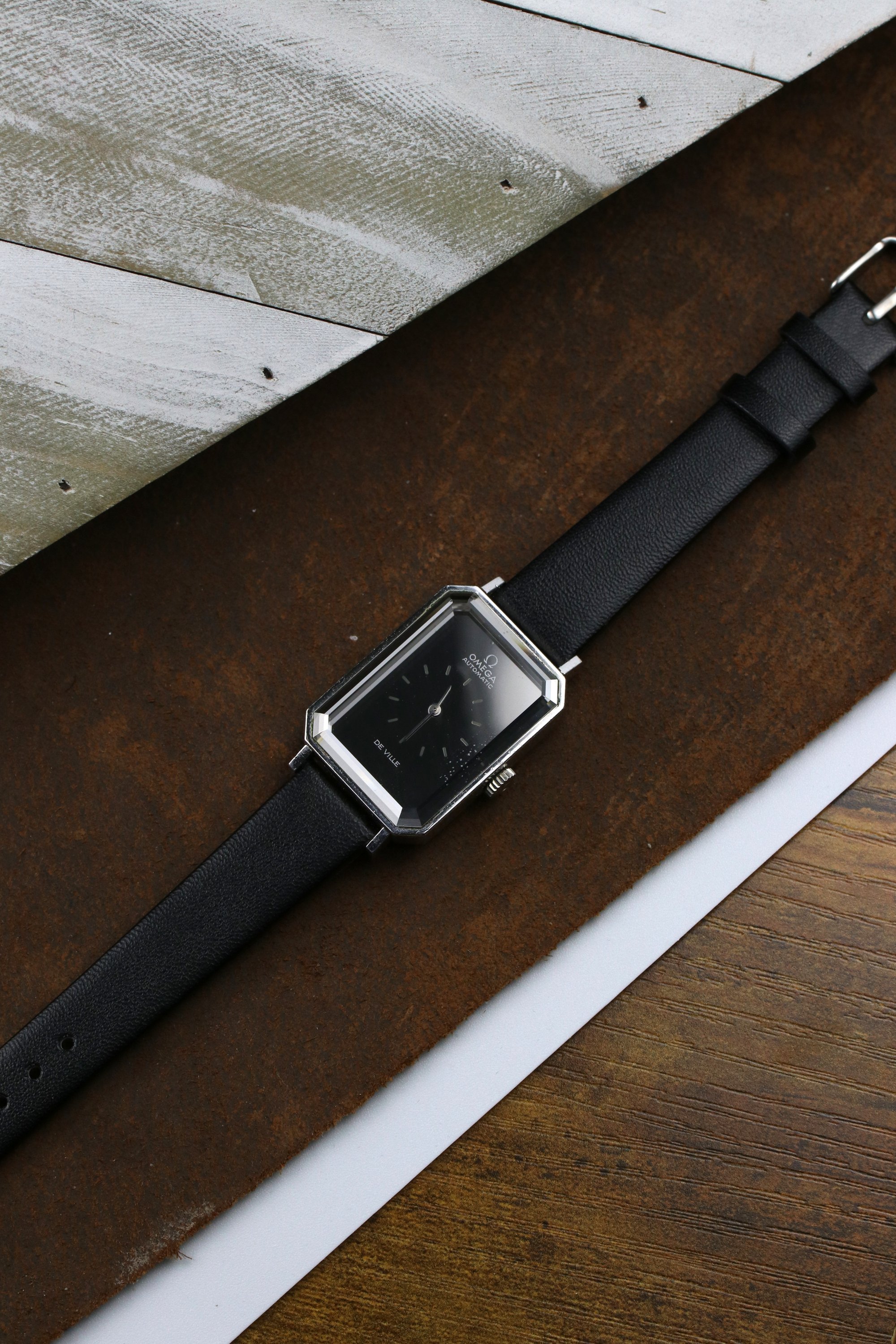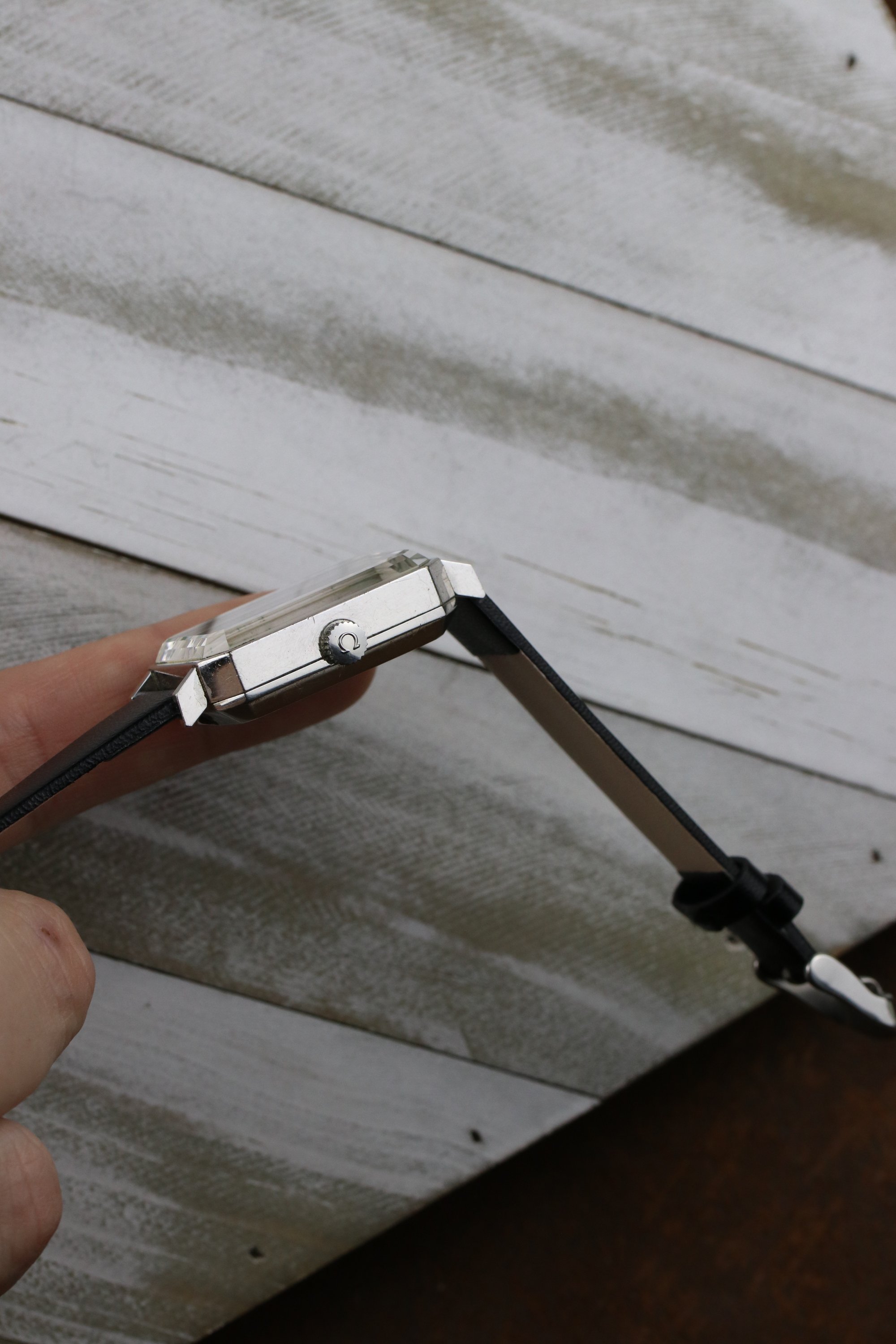 Okay back to this specific De Ville, its a striking example of Grima's design language. Has this rectangle tank style case with dramatically beveled edges, bold and angled cuts on the corners of the glass cut crystal. The dial has a stunning effect, fades from deep black to near silver color depending on the light. The occasional glimpses of iridescence on the crystal as the light beams down the crystal. A pretty piece with lots of history. It's powered by the automatic 661 Omega Cal. that holds time well. It's on a leather aftermarket band. Happy to answer any questions and provide more pictures!