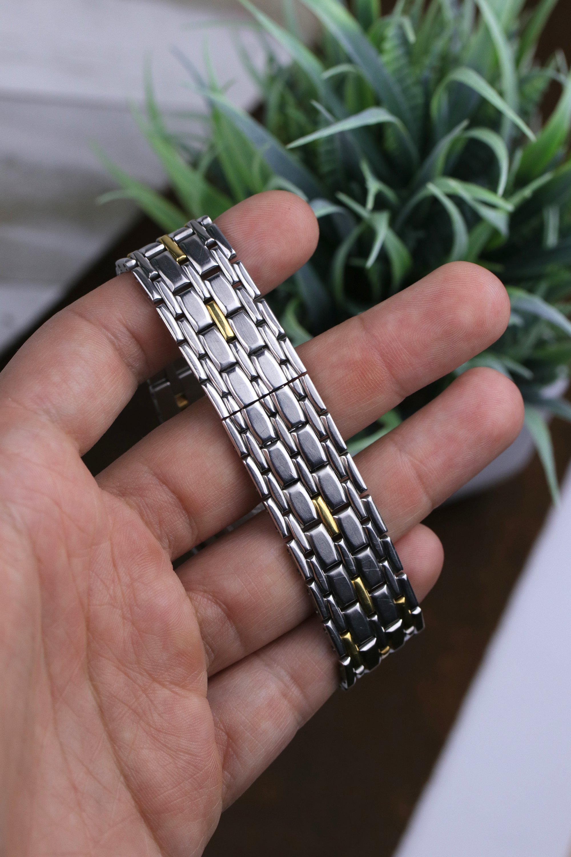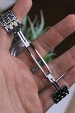 While there are many things to love about this piece, i can't keep my eyes off the integrated bracelet. Each link flows gracefully into the next. The brushed silver and the warm glow of the gold links catch the daylight beautifully. Currently the bracelet size is 18.5CM/7.2" + 1 additional link that adds .5CM or .20 of an inch. Max bracelet size with the additional link is 19CM/7.4".