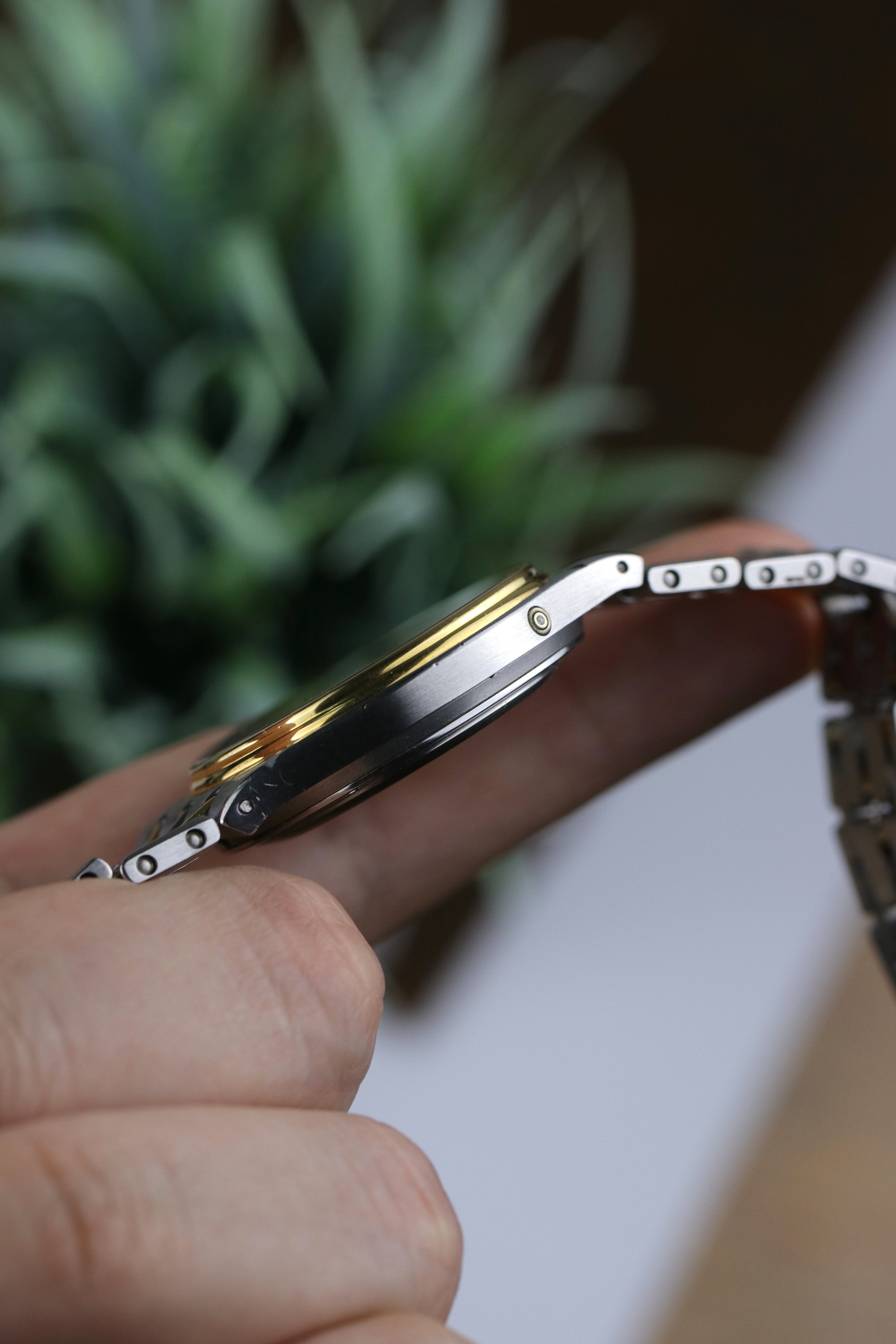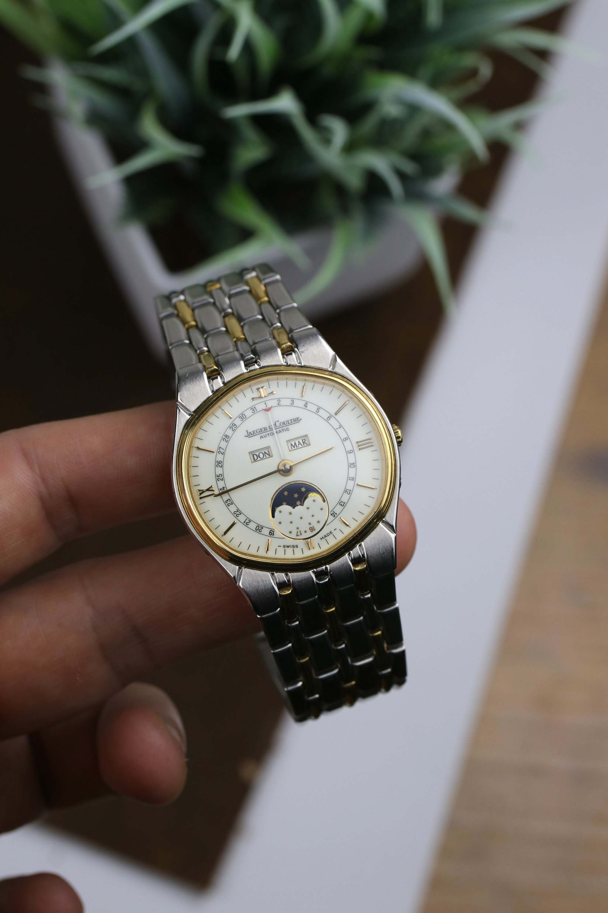 Originally purchased on July 25th, 1988 from Wempe in Stuttgart, Germany - here is a stunning and highly elusive Jaeger-LeCoultre Albatros with the triple calendar moonphase complication. The bezel plays a little trick on the eye, appearing round at first glance, but yet has a softly hexagonal form as you shift your perspective. The dial is a warm, creamy white color, carrying a full suite of complications: pointer date, day, month, and moonphase. What's truly mind bending is that despite housing the automatic 888 movement with all of the complications, the case measures just at 8.7mm thin. How JLC engineers came up with this design, such a complex package is beyond comprehension but then again, that's exactly the kind of the sorcery we've come to expect from them. The bezel, crown and the alternating links are solid 18K gold.