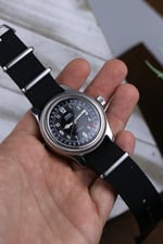 Here is a Big Crown Pointer Date 7503 in excellent condition. Has a rare bulleye dial, especially for this reference. Transitioning from black to grey and back to black, this dial creates a stunning sense of layered depth. This 7503 also has a bold presence coming in at 44mm - this size is incredibly hard to come by as in the 1990s -as 36mm was the standard. It's on a new NATO bracelet. Powered by Oris 654 movement that has been freshly serviced in 2025 by Oris. Happy to answer any questions and provide more pictures!