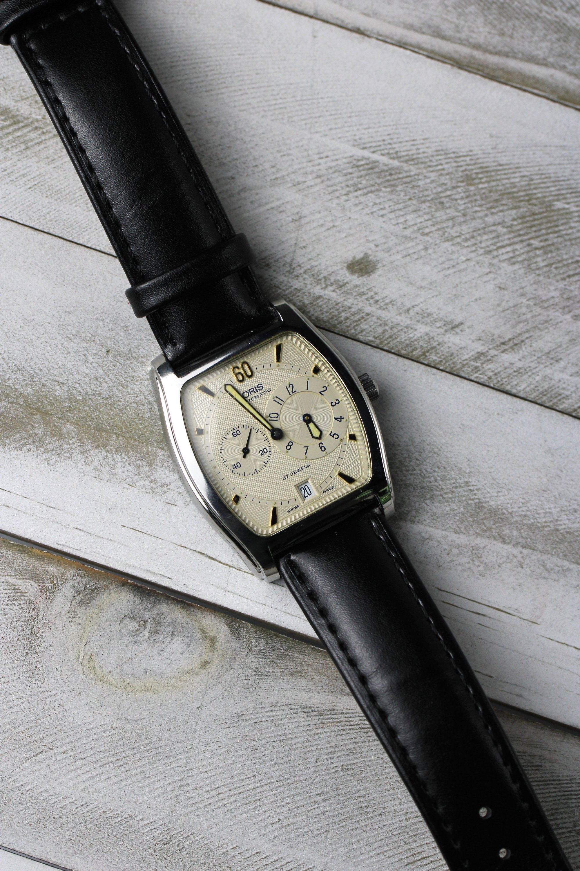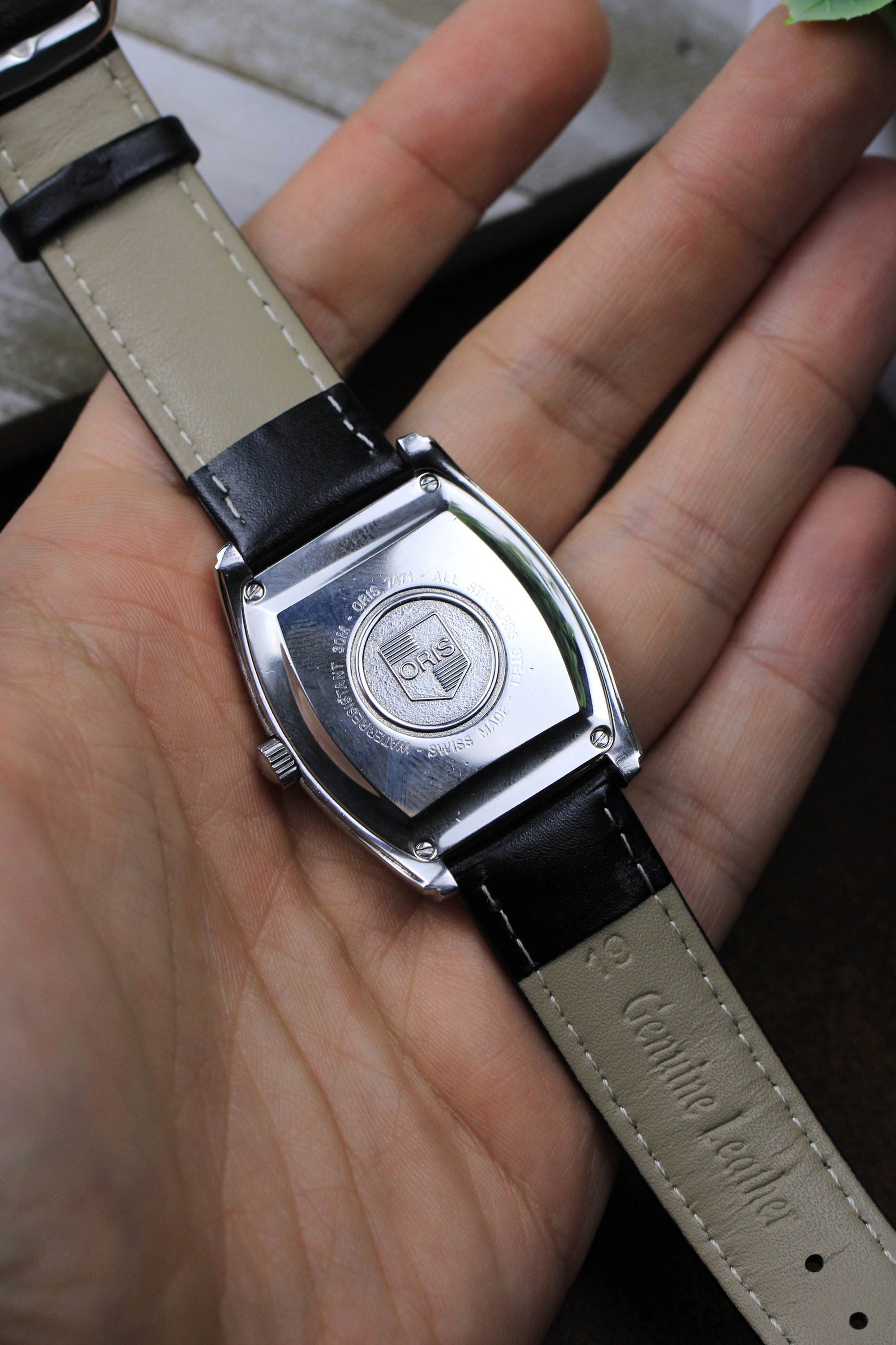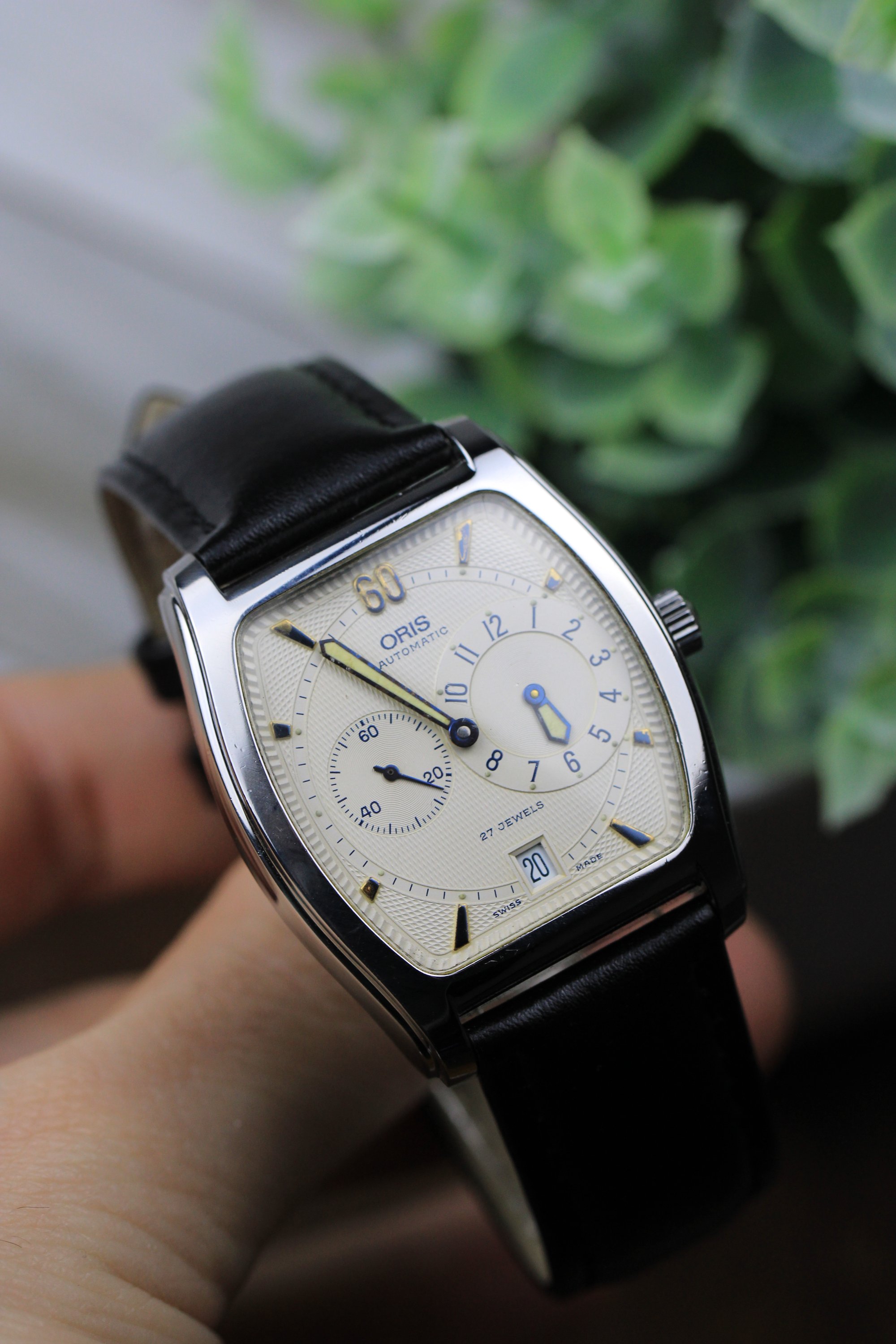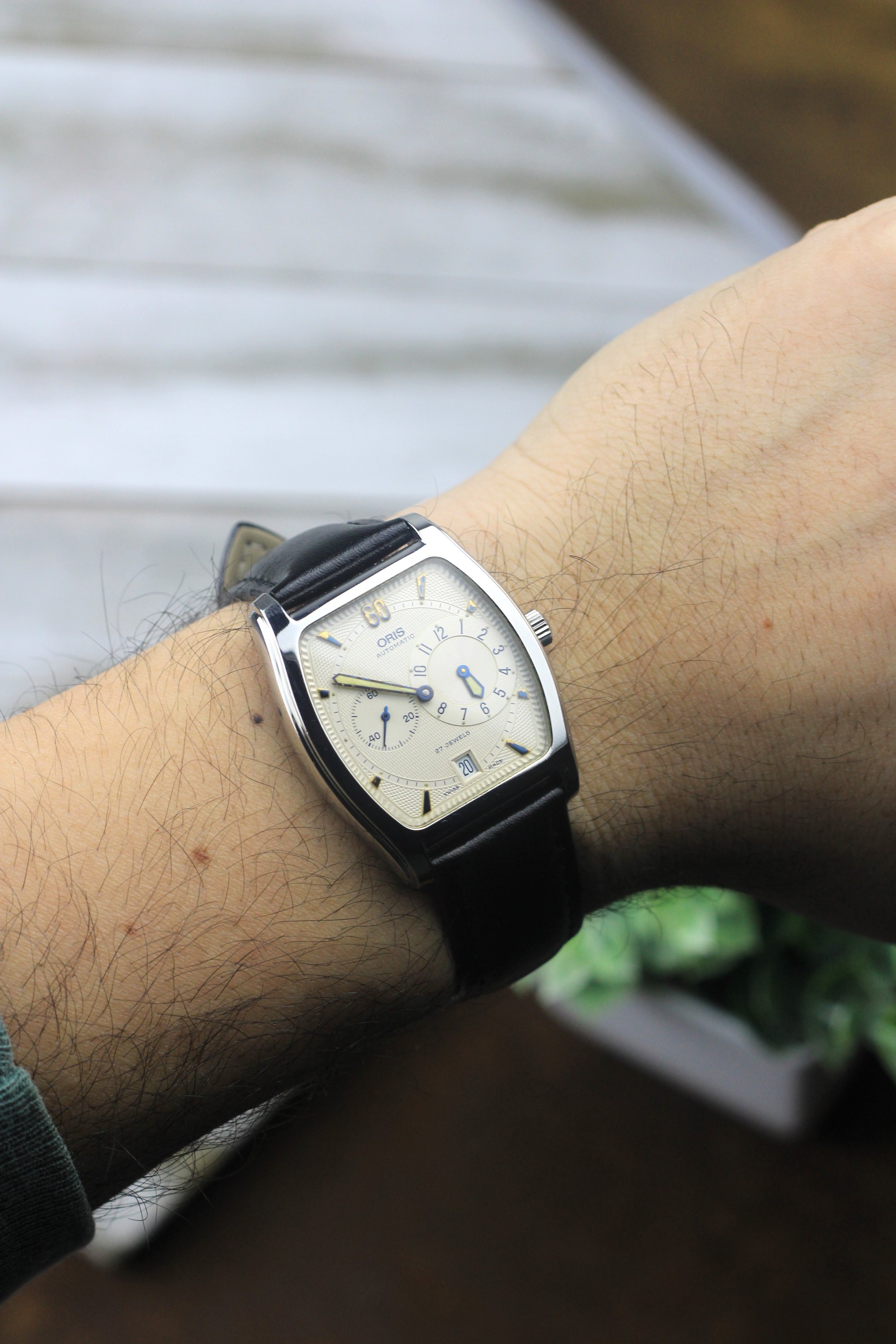 Another gem from the 90s. Tonneau shaped case with a cream dial that catches light beautifully throughout the day. Swaps between cream and white depending on the light. Micro guilloche all around the inner and outer dial. Blue hands pop against the backdrop. The tonneau shape offers something different from the usual round case — sits uniquely on the wrist and stands out in a subtle way. Powered by the automatic 649 Oris cal. holds time accurately. Happy to answer any questions and provide more pictures!